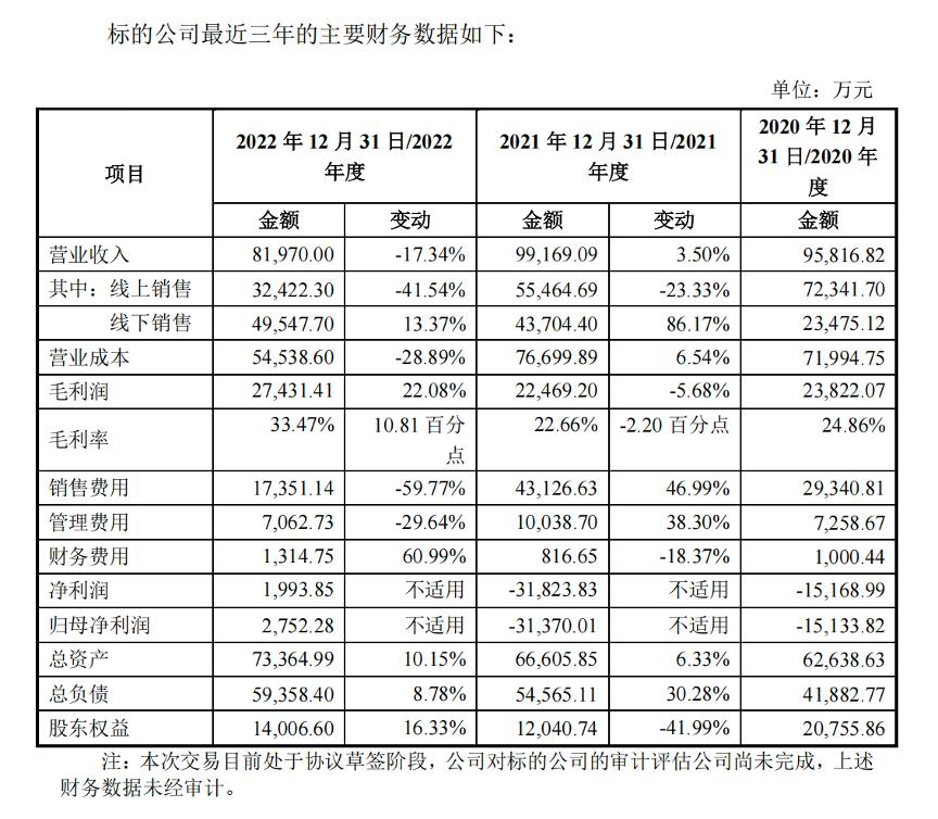 从前述交易公告披露的业绩数据中来看,发展至2022年,杭州金羚羊营收下滑明显,2020年至2022年间,杭州金羚羊分别实现营业收入9.58亿元、9.92亿元及8.2亿元,2022年营收同比下滑17.34%,其中,线%。报告期内,归母净利润分别为-1.51亿元、-3.14亿元和2752.28万元,在2022年实现扭亏为盈。