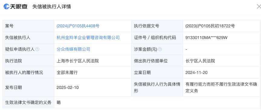 天眼查显示,截至目前,杭州金羚羊共有6条被执行人信息,被执行总金额超1.4亿元,历史被执行人信息16条,被执行总金额超3.2亿元,失信被执行人信息9条,涉案金额约2.89亿元,另外,还有26条股权冻结信息。